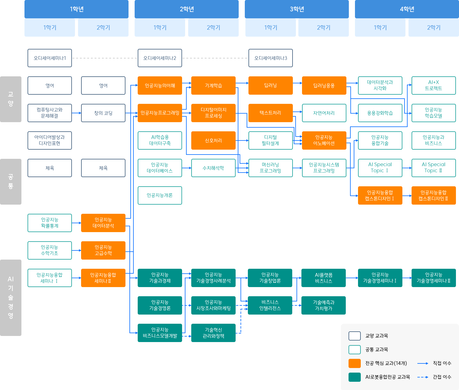 교양/공통과목 필수교과목 단일전공 - 오디세이세미나3, 인공지능융합캡스톤디자인 | 복수전공 - 인공지능융합캡스톤디자인 | 23학번 이전 입학생은 인공지능융합캡스톤디자인 | 또는 Ⅱ 이수 권장. 24학번 이후 입학생은 인공지능융합캡스톤디자인 | 이수 필수. 교양/공통/AI의료 교양/공통/AI로봇 교양/공통/AI기술경영