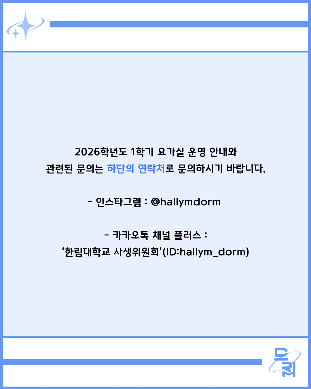 - 카카오톡 채널 플러스 : ‘한림대학교 사생위원회’(ID:hallym_dorm)