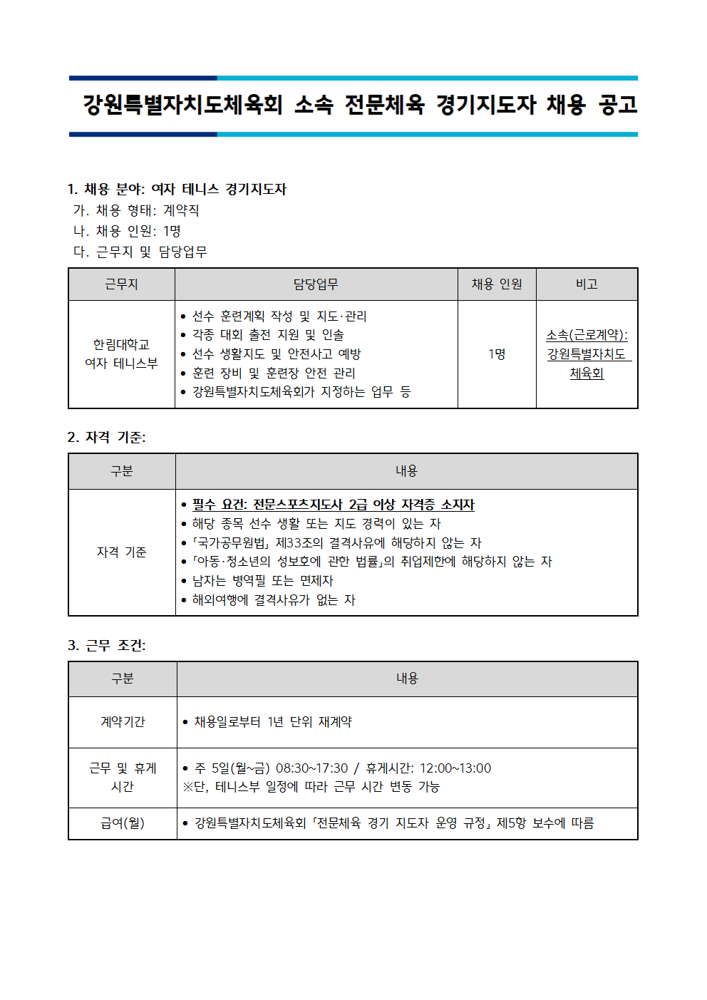| 1173 | 강원특별자치도체육회 소속 전문체육 경기지도자 채용 공고(~3월 27일 15:00까지) | 총무팀 | 2026-03-23 | 516 |