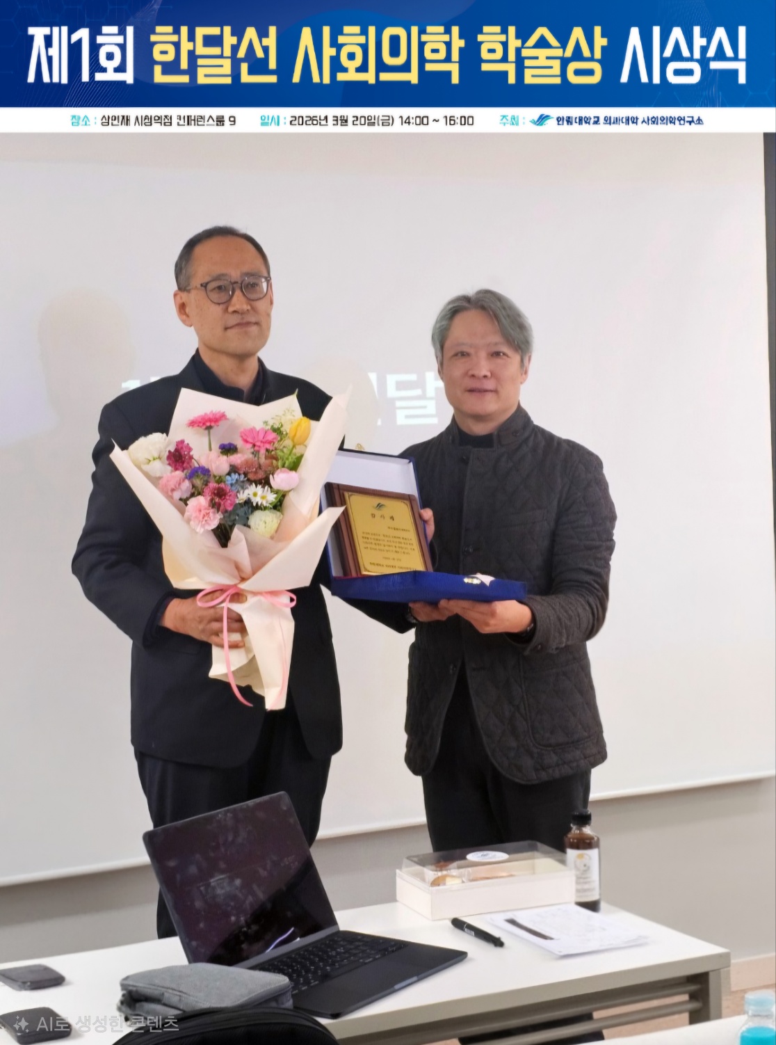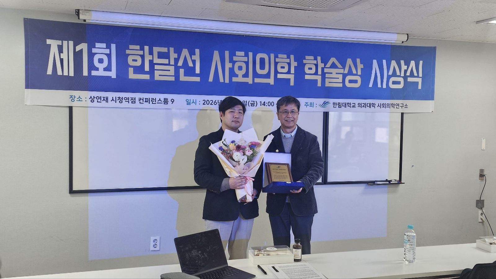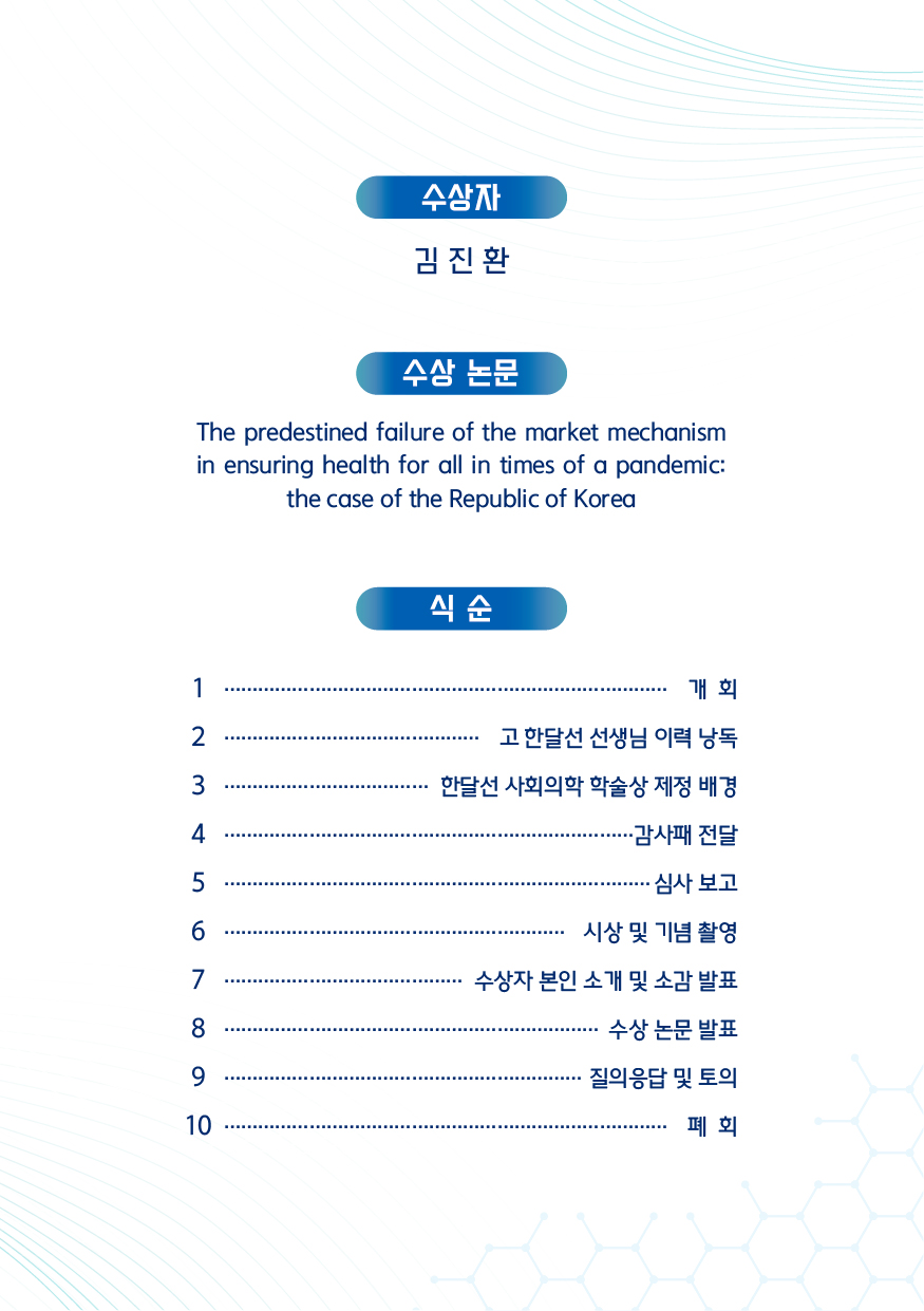 2026년 3월 20일(금) 14:00, 서울 상연재 시청역점 컨퍼런스룸 11에서 제1회 한달선 사회의학 학술상 시상식이 열렸습니다. 사회의학연구소 이혜은 교수의 사회로 진행된 식순은 위와 같습니다.
