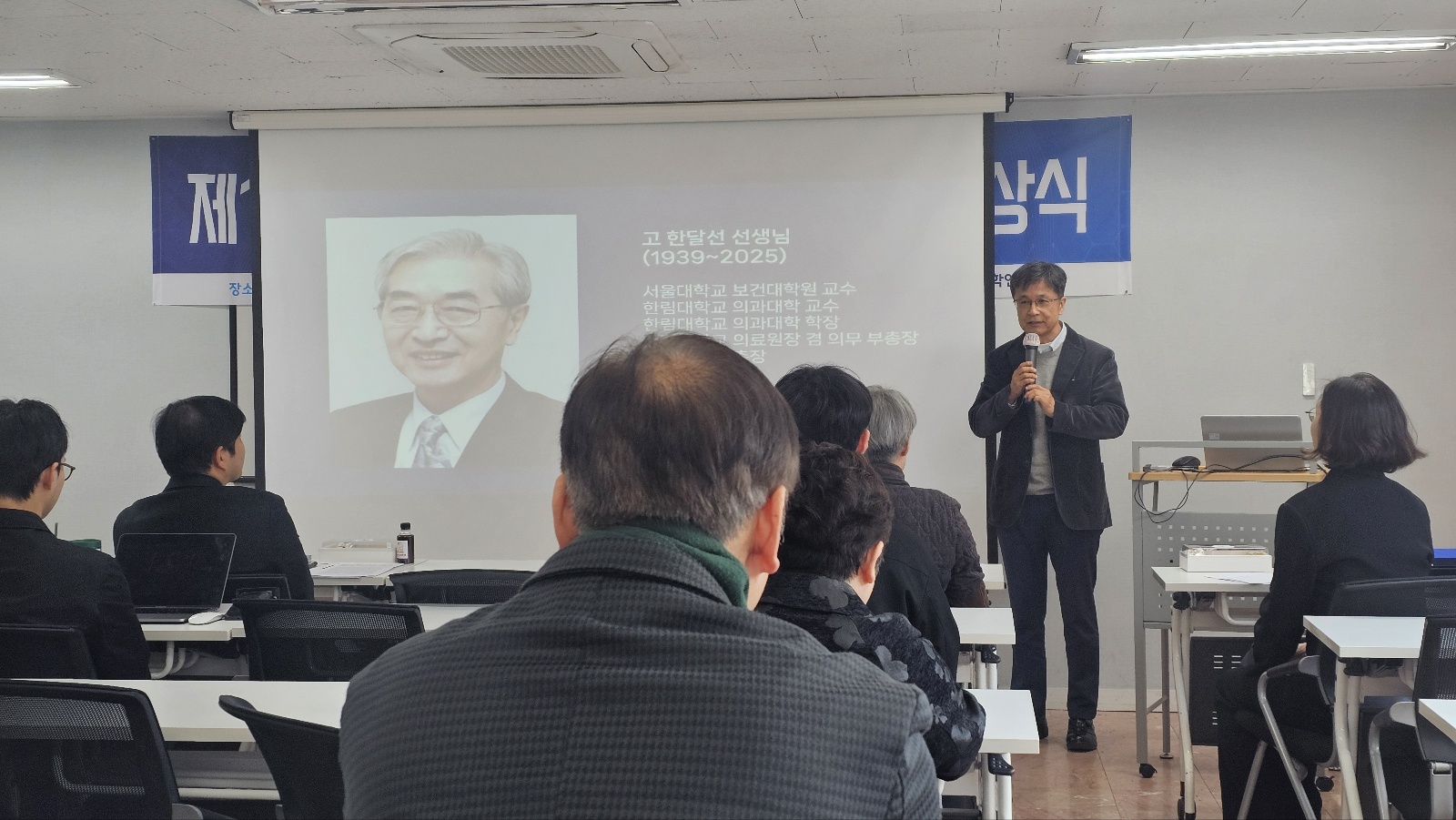 이어 학술상 심사 위원장 김동현 교수가 한달선 사회의학 학술상 제정 배경을 설명하였습니다.
